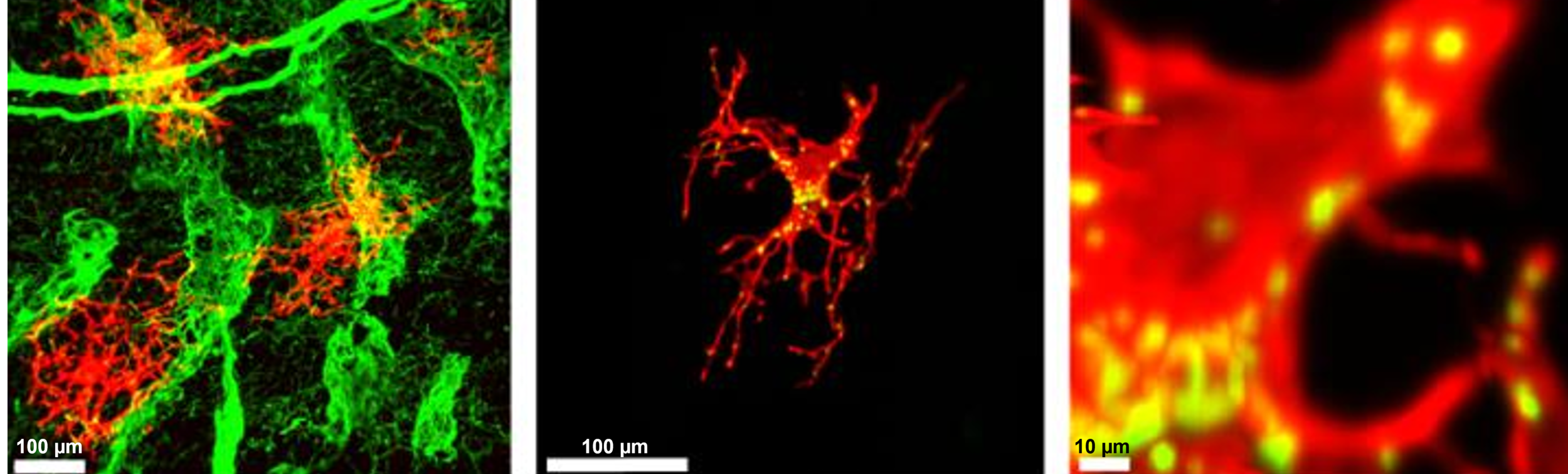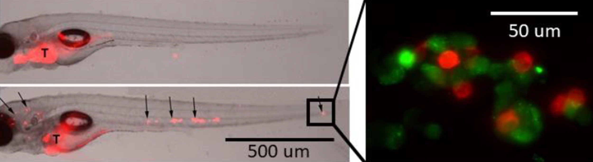 Xenografts in Zebrafish. Top left panel: TC32 Ewing sarcoma cells stably labeled with DsRed engrafted in Zebrafish & establishment of primary tumor xenograft (T) 2 days post-implantation. Bottom left panel: Metastatic colonies in the head, torso and tail (arrows). Right panel: Light-sheet imaging of a mosaic labeled colony.